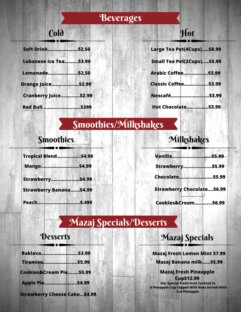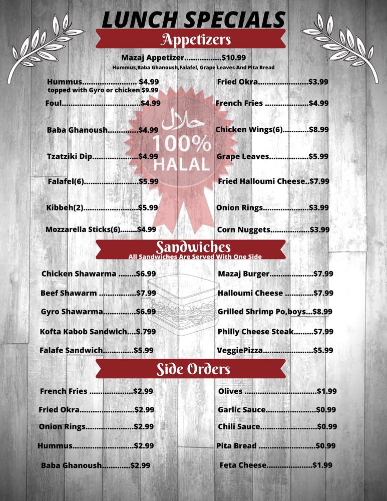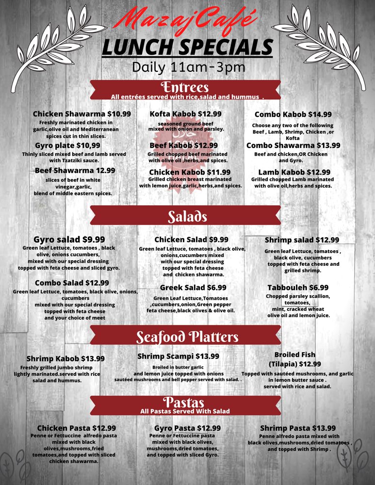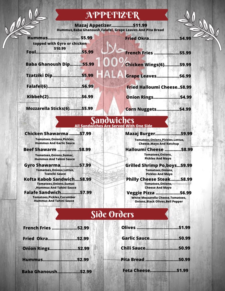Welcome to Mazaj Café, a Middle Eastern-Greek fusion restaurant located in Kenner, LA. Offering a variety of appetizers including flavorful 6 Chicken Wings, crispy Falafel, and savory Grape Leaves, Mazaj Café aims to tantalize your taste buds from the first bite. For entrees, indulge in the Beef or Chicken Kabob Plate, marinated with a blend of herbs and spices, served with Hummus, rice, and salad. Don't miss out on their refreshing salads like the Chicken Salad or the Combo Salad, both bursting with fresh ingredients and delicious flavors. With a casual and trendy ambiance, Mazaj Café provides a cozy spot for families and friends to enjoy a meal together. Whether you dine in or opt for delivery or takeout, Mazaj Café welcomes you with open arms and a menu full of mouthwatering options.